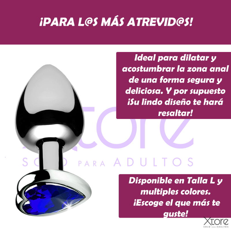 Este Plug Anal, de acero inoxidable, es suave y diseñado anatómicamente para dilatar antes de la penetración anal. Es pesado, comparado con los plugs plásticos. Decorado en su extremo inferior con un zafiro en forma circular
